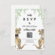 O moderno Dinossauro tematizou o cartão de resposta do website RSVP on-line de código QR do RSVP do casamento com noiva de dinossauro engraçada, noiva de noivo e folhagem de eucalipto aquática para trazer alegria Jurássica pré-histórica para o dia do seu casamento. A moderna caligrafia tipográfica química com modelos fáceis de personalizar, para que você possa adicionar o código QR do site de casamento e o endereço Web do navegador e instruções úteis para convidados. Noiva T-Rex divertida e noiva com um verde-botânico de cor d'água, obra de arte original da artista Catherine Sweetman Ideal para a recepção no dia do casamento ou janto de ensaio. A suíte de casamento combinando inclui tudo o que você precisará na sua divertida viagem de casamento
