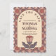 "Anuncie seu grande dia com este lindo cartão 'Save the Date', apresentando um intrincado motivo floral inspirado no Art Nouveau e um padrão de vitral antigo. A paleta terrosa e quente de terracota e rosa poeirento proporciona um clima romântico e retrô-moderno. As cores do padrão de fundo são 100% ajustáveis, permitindo que você personalize o design para combinar com o tema exclusivo do seu casamento. O verso inclui um código QR funcional para que seus convidados acessem instantaneamente o site do seu casamento para obter detalhes de viagem e RSVP."