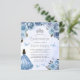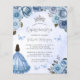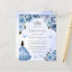 Este adorável convite da quinceañera mostra uma fronteira de rosas azuis com folhagem cintilante prateada em fundo azul de aquarela. Uma tiara prateada, uma menina de cabelo escuro em um vestido de princesa azul e pequenas borboletas azuis decoram o texto. A palavra "Quinceañera" e o nome do convidado de honra aparecem no elegante guião de escrita manual de cinzas prateadas, com o texto remanescente na fonte sans serif de cinzas. Adicione texto adicional no verso, juntamente com um código QR para ajudar seus convidados a visitar seu site quinceañera e RSVP on-line.