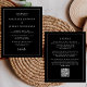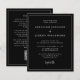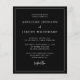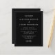 Este simples e minimalista convite de casamento moderno apresenta fontes clássicas de serifa branca num fundo preto, com palavras e frases selecionadas na caligrafia de escrita manual de na moda. Uma linha branca fina fornece um quadro retangular para o texto. No verso, adicione os detalhes do seu casamento e um código QR que os seus convidados podem digitalizar para visitar o seu site de casamento. NOTA: os envelopes não são incluídos automaticamente nestes convites de orçamento, portanto lembre-se de escolher a opção "envelopes brancos"!