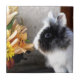 Retrato do coelho anão preto e branco (Mammal) próximo às margaridas amarelas