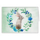 Um adorável coelho aquoso olha para trás enquanto senta dentro uma bonito coroa azul. A imagem é colocada sobre um fundo verde-claro de lavagem com aquarela. Útil para cumprimentos pessoais e muitas ocasiões. O dentro é vazio para sua própria mensagem.