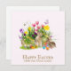 Este cartão de férias plano apresenta um dos meus desenhos de colagem de coelhos da Páscoa no jardim de flores com ovos de Páscoa coloridos. Personalize este cartão da Páscoa com sua mensagem de Páscoa e nome.