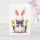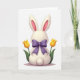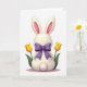 Este cartão apresenta um pequeno coelho 🐰 visto por trás em um fundo branco brilhante, dando à cena um sentimento tímido e afetuoso, como se estivesse esperando por alguém especial para notar. O coelho é sombreado em marfim cremoso com gradientes suaves, e suas orelhas longas se erguem para cima com uma tonalidade rosa claro nas bordas internas. Uma rica fita violeta é amarrada em um laço brilhante na base do pescoço, adicionando um toque elegante, como se estivesse pronto para uma visita doce de primavera. Uma cauda branca redonda e fofa fica logo abaixo, com pelo texturizado que contrasta com o corpo mais liso e a fita elegante. Em ambos os lados do coelho, duas flores amarelas 🌷 estão dispostas de forma equilibrada, cada uma com caules verdes e acentos folhosos que enquadram a figura central como uma saudação gentil. O texto de saudação fica perto do topo em uma tonalidade lavanda suave, com texto menor colocado perto da parte inferior em cinza atenu