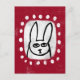 Um coelho desenhado bonito em preto e branco sobre um fundo texturizado vermelho cercado de pontos brancos.