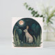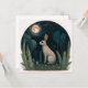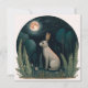 Um coelho feliz senta-se ao luar entre flores e outras plantas com árvores altas ao fundo.