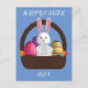 Cartão postal Colorido de Coelho da Páscoa, cesto e ovos coloridos com nome personalizado para crianças.