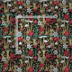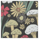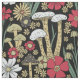 Este tecido apresenta cogumelos vermelhos, verdes, bronzeados e flores em fundo preto.