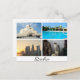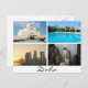 Cartão-postal com 4 imagens diferentes de Doha, a capital do Qatar, como o museu das artes islâmicas MIA, uma piscina com a linha do horizonte de Doha, arranha-céus de Doha ao pôr do sol e um falcão com o texto: "Doha".