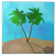 Azulejo cerâmico com padrão de praia de palmeiras tropicais, areia e céu feito a partir de uma colagem digital de aquarela e imagens padronizadas