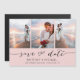 Escolha as melhores fotos de sua filmagem de noivado ou suas fotos favoritas de vocês dois para salvar a data perfeita. As palavras salvar a data são manuscritas para dar uma sensação pessoal ao cartão. A frente tem 3 imagens e a parte traseira tem uma grande imagem com um filtro branco no topo.
