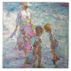 Uma mãe, com o chapéu de sol suavemente inclinado, guia duas crianças por uma poça de mar cintilante de cor e luz. Eles se inclinam com curiosidade, procurando tesouros marinhos sob as ondulações — conchas, pedras, talvez memórias. A cena captura a inocência da infância e a força tranquila da presença materna. As ondas brilham em tons de turquesa e lavanda, enquanto sombras suaves dançam na areia banhada pelo sol. Há movimento, mas também quietude — como um momento suspenso no ar quente e salgado.