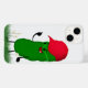 Uma pessoa engraçada, picles verde, com capim verde sobre fundo branco com óculos verdes e um boné vermelho.