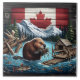 Um castor está coletando galhos em um lago, enquadrado por montanhas majestosas e um pano de fundo canadense com peixes nadando nas proximidades.