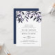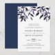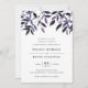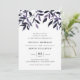 O convite para casamento elegante e russo apresenta letras ricas fora do preto em blocos quicos e itálicos, tocado por uma borda de folhagem de cascata em tons de outono de púrpura e azul de meia-noite. As costas do convite são marinho azul sólido.