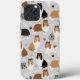 Cães de Collie Rough Cute sentam-se e ficam de pé e rollover com casacos sápidos, tricolores, unidos e brancos com ossos de cão espalhados e padrões de pegadas.