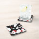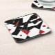 Várias formas geométricas brancas e vermelhas estão espalhadas sobre um fundo preto, criando um forte contraste. Algumas formas são interconectadas com linhas brancas finas, e pontos vermelhos adicionam um pop de cor à composição.