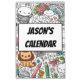Um design de calendário para crianças personalizável com um rabisco de rabisco cheio de animais encantadores, arco-íris, flores e objetos brincalhões como lápis e borboletas coloridas. No centro, um painel ousado mostra o texto "Calendário de Jason", facilmente personalizável para qualquer nome. O estilo de arte é animado e convidativo, perfeito para uma plateia jovem.