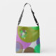 A modern abstract tote bag featuring colorful circular floral shapes floating freely on a soft, artistic background.