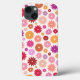 Colorful flower pattern in yellow, orange, pinks, lilac and reds on a cream color background.