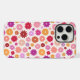 Colorful flower pattern in yellow, orange, pinks, lilac and reds on a cream color background.