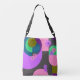 This tote bag features a bold abstract design with colorful geometric shapes layered over a dark vintage-inspired background.