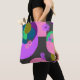 This tote bag features a bold abstract design with colorful geometric shapes layered over a dark vintage-inspired background.