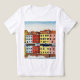 The image shows a watercolor painting of a row of colorful houses overlooking a canal with boats. The houses and boats are reflected in the water. The painting is reminiscent of the style of Italian towns such as Burano, famous for its colorful houses.
