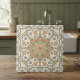 This Mediterranean tile design features a colorful arrangement of swirling scrollwork and stylized floral motifs in warm, sun-washed teal, terra cotta and green tones on a textured ivory background, creating a gently weathered, hand-painted look. Its harmonious symmetry and classic Mediterranean character make it ideal for adding subtle sophistication to coastal, rustic, or Old World-inspired interiors. Search ID1195 to see other products in this unique design set. Note: design may contain generative content