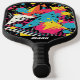 A vintage 80's memphis spatter pattern decorates this pickleball paddle. Personalize it with your name.
