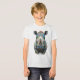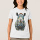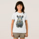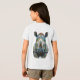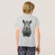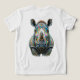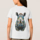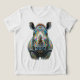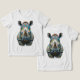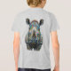 Detailed realistic rendering with expressive eyes, powerful horn, wrinkled face, and artistic watercolor background in soft green tones. Bold, modern wildlife art blending nature strength with playful pop-art energy and psychedelic flair.