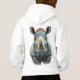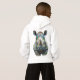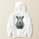 Detailed realistic rendering with expressive eyes, powerful horn, wrinkled face, and artistic watercolor background in soft green tones. Bold, modern wildlife art blending nature strength with playful pop-art energy and psychedelic flair.