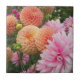 Azulejo cerâmico maravilhoso com a foto de um jardim de flores coloridas, laranja e cor-de-rosa Dahlia. Um design floral adorável! Selecione o tamanho do seu azulejo. Faz uma trivet de cozinha excelente!