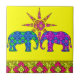 Elefantes de salsa coloridos ao sol em azulejo de cerâmica amarela. Para mais decoração caseira de elefantes paisley, visite o resto desta loja!
