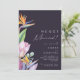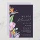 Este colorido anúncio de casamento tropical roxo é perfeito para o seu casamento verde, roxo e bege moderno e boêmio. O design apresenta um buquê elegante de folhagens e flores clássicas de aquarela de praia, incluindo eucalipto verde-sage, protea rosa e vermelha, hibisco rosa bege, ave-do-paraíso laranja e azul, e folha de palmeira verde escura. O design é ideal para um casamento de viagem simples, criativo e único para a primavera, verão, outono ou inverno! Por favor, encontre outros materiais de papelaria de casamento correspondentes ou coordenados no restante da coleção.