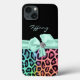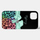 Capas de iphone motriz feita em preto, no topo e um impressão onça colorido, no fundo. Gráficos de fita de menta e arco, com sotaque de diamante, decoram o meio da caixa. Personalize o texto colorido da casa da moeda para você mesmo ou como uma ideia perfeita de presente.