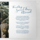 Um texto moderno de seis páginas com um programa de renovação de casamento em azul e branco. Edite este programa de casamento com seus próprios nomes de renovação de casamento, datas, introdução, redação de cerimônias, assistentes de festa de casamento, foto de seu primeiro elopeio ou casamento restrito, e seus obrigados. Design original por www.mylittleedenweddings.com
