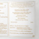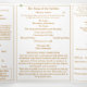 A Tradicional Massa Nupcial Latina é uma celebração profundamente reverente e bela do Sacramento do Matrimônio, rica em tradição e profunda espiritualidade. Projetado especificamente para um casamento Tradicional em Massa Latina, o triplo programa de casamento "Virgin Mary TLM" contém as partes necessárias da Rita Nupcial Latina. O cobrir frontal mostra a imagem da Virgem Maria exibida como um oval no canto superior direito em meio à imagem de rosas contra um fundo branco. O título é apresentado numa fonte Nupcial de cor ouro, enquanto que o subtítulo é apresentado numa impressão clara. Nomes de noiva e noivo também são exibidos em uma fonte Nupcial. O nome e o endereço da igreja aparecem no fundo num impressão menor. Com explicações da missa mostradas por toda parte, essa elegante design também inclui o nome do oficial do casamento, nomes de servidores de altar, nomes dos pais da noiva e dos pais do noivo, nomes de festas de casamento incluindo os nomes de madrinha e melhor homem, espaço para até sete damas de honra e nomes de padrinhos de casamento, além dos nomes da florista e do portador de anel. Além disso, a design do cobrir traseiro apresenta a foto que você fornece, mostrada como um oval abaixo de um verso da bíblia (ou sua mensagem) sobre fundo branco. Todo texto é personalizável. Projetado para coordenar com a "Virgem Maria Católica Suite de Casamento".