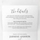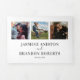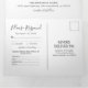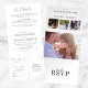 Elegante, tudo em um convite minimalista de casamento triplo, com um fundo branco, fotos da noiva e do noivo, seus detalhes de casamento, um convite de casamento, e um cartão postal de entrada de comida rsvp para seus convidados cortarem e enviarem de volta.