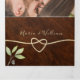 Elegante, moderno convite de casamento de madeira rústica em três dobras com folhagens em aquarela, coração de corda dourada simples e foto personalizada do casal no verso.