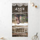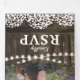 Um convite de formatura trifold rústico country 2 em 1 com fundo de barril de madeira rústico, luzes de corda cintilantes, padrão floral delicado de babys breath, fotos do formando, ano da turma, detalhes da celebração de formatura e cartão de resposta para os convidados destacarem e enviarem de volta.