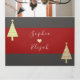 Celebre um casamento de inverno festivo com este convite moderno de três dobras, apresentando tons vermelhos profundos, pretos e marfim com toques caprichosos de árvore de Natal. Um layout de caligrafia romântica inclui espaço dedicado para detalhes da cerimônia, RSVP e notas personalizadas - tornando-o um design perfeito, ecológico e elegante, tudo em um. Por favor, note: Este convite requer um envelope separado para envio. Recomendamos o uso de um envelope padrão A9 (5,75 "x 8,75").