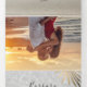 Simples, moderno, tropical, convite triplo de verão para casamento na praia, com folhas de palmeira douradas, areia e ondas do mar e foto do casal.