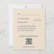 Este elegante cartão RSVP da coleção Sunset Serenade continua a perfeita harmonia da suíte de convites, a riqueza cultural e o estilo contemporâneo. ✨ Frente Design: Calor e romance radiante, a frente apresenta a assinatura do fundo de cor d'água Sunset Serenade — um brilhante céu laranja-ouro com torres de templo silenciado e flores vibrantes que evocam o espírito de uma celebração sagrada. A mensagem, "gentilmente Deixe-nos saber até 03.07.20XX", é apresentada numa fonte graciosa e moderna, lembrando gentilmente aos convidados que respondam enquanto se misturam lindamente com a poesia visual do cartão. 📝 Lado Inverso - Pensativo e Prático: O dorso oferece um layout de creme limpo e refinado para seus hóspedes: Indique a presença Observe o número de hóspedes Compartilha quaisquer preferências dietéticas ou outras notas especiais Há flexibilidade para seleção de refeições ou instruções adicionais dependendo das necessidades de sua celebração, permitindo que os casais adaptem a experiência à sua visão. 📱 Opção digital sem falhas: um código de QR digitalizável na parte inferior direciona os convidados para o seu site de casamento ou formulário de RSVP, fazer o processo de resposta fácil e moderno. Abaixo, uma nota educada diz: "Para responder online, por favor, digitalize este código QR." Combinando o design do eterno com uma função amigável, esta placa RSVP é uma combinação perfeita para casais que buscam elegância, tradição e conveniência — tudo isso em um só.