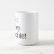 Caneca branca com texto preto e um ponto de exclamação vermelho