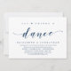 Tema azul naval moderno e sofisticado, cartão de convite de casamento furtivo (Coma, Beba e Dance). É perfeito para a sua celebração casual de casamento às margens de um lago.