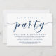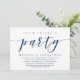 Tema azul naval elegante com letra moderna, cartão de convite de casamento furtivo (Coma, Beba e Festeje). É perfeito para a sua celebração casual de casamento furtivo à beira do lago.