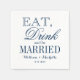 Coma bebida e se case com guardanapos de casamento de papel branco e azul marinho. Design de tipografia de script elegante para festa de casamento de classe. Caligrafia manuscrita na moda combinada com fontes formais quic. Modelo de tendências com cores de fundo personalizáveis. Um slogan bonito para a mesa de janto chic rustic country. Excelente para jantadas de ensaio. Personalizado com o nome da noiva e do noivo e a data do casamento. Belo decoro formal de casamento.