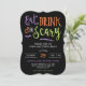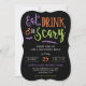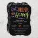 Convide seus amigos e família para a sua cesta de Halloween em estilo com este convite do Festa de Halloween! Apresentando as palavras "Coma, Beba e Seja Assustador" em um esquema de cor roxo, laranja, preto e verde. Estes convites são feitos em forma de suporte para um toque de elegância. Não seria mais fácil personalizar o modelo para ajustado da sua festa!
