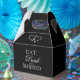 Coma bebida e seja casado com as caixas de favor de casamento preto. Bonita ideia de presente de festa de casamento para os convidados. Caixas em forma de esboços ou doces caseiros. Design de modelo de tendências com tipografia de na moda e dois corações duplos de encravamento. Obrigado personalizado que você envia uma mensagem com nomes ou monogramas de noiva e noiva mais data de casamento. Na moda e acessórios elegantes para dizer obrigados por vir. Divertido por casamentos alegres e ricos. Excelente como presente para chás de panela, damas de honra, noivado ou aniversário. Altere a quantidade para obter o preço em massa barato. Design preto e branco do conjunto de coleção de classe. Fundo de cor personalizável.